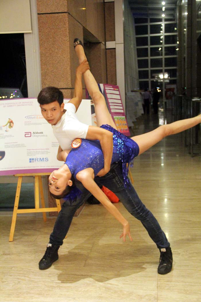 | Cô và bạn nhảy thực hiện một động tác khó. |
