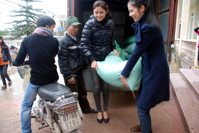 | 2 người đẹp tự tay trao tặng phần gạo cho các hộ gia đình nghèo. |