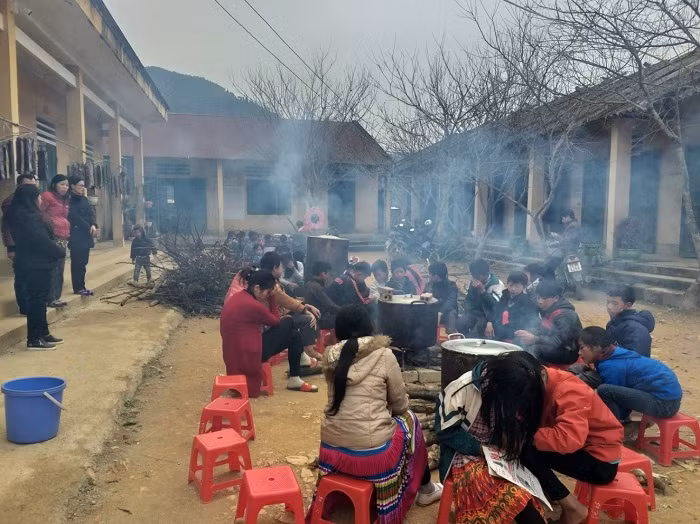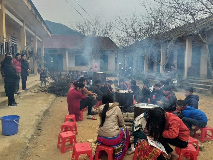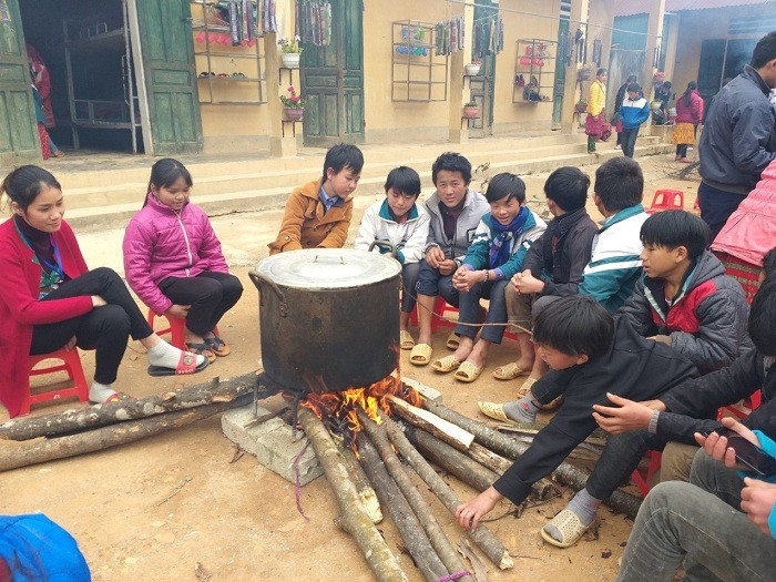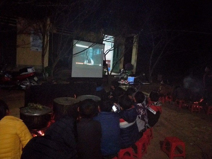 Trong buổi tối, thầy cô giáo và các em học sinh đã cùng nhau thức canh nồi bánh, để các em hào hứng hơn, nhà trường đã tổ chức cho các em xem phim.