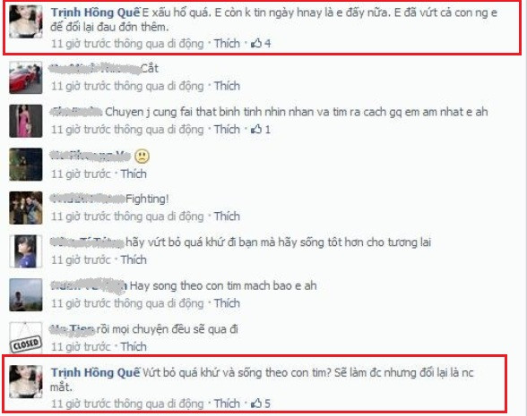 Ngay sau đó, Hồng Quế đã có những bình luận dưới dòng trạng thái của mình, cô lại tự trách mình thật sự ngu ngốc vì đã chạy theo trái tim mà mất hết lí trí và những đau đớn. Điều này khiến mọi người đoán rằng cô đang vướng mắc phải chuyện tình cảm.