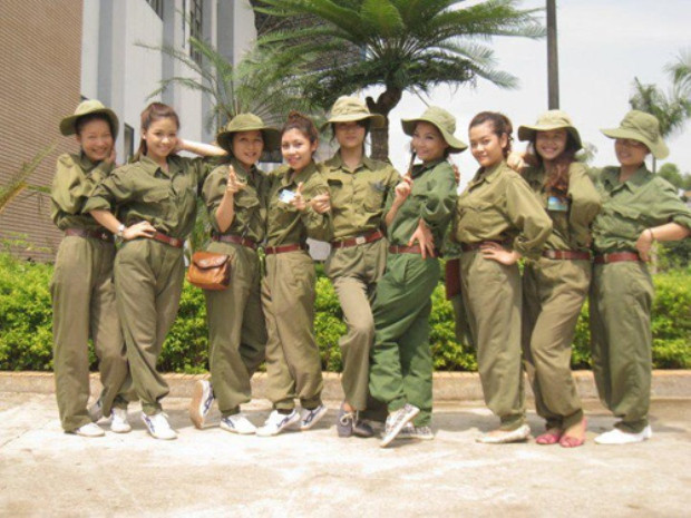 | Hương Giang đứng đầu tiên khi chụp hình xì tin cùng bạn bè. Họ đã có một kỳ học quân sự rất vui vẻ bên nhau. |