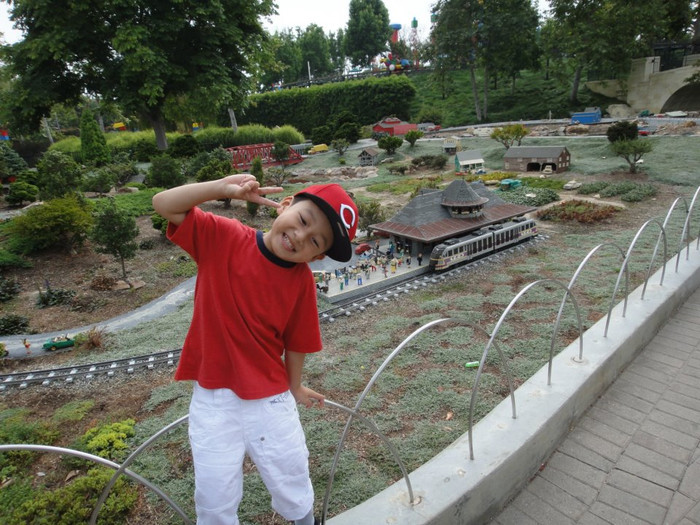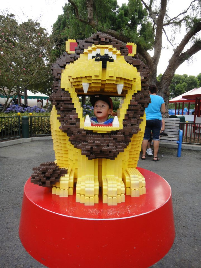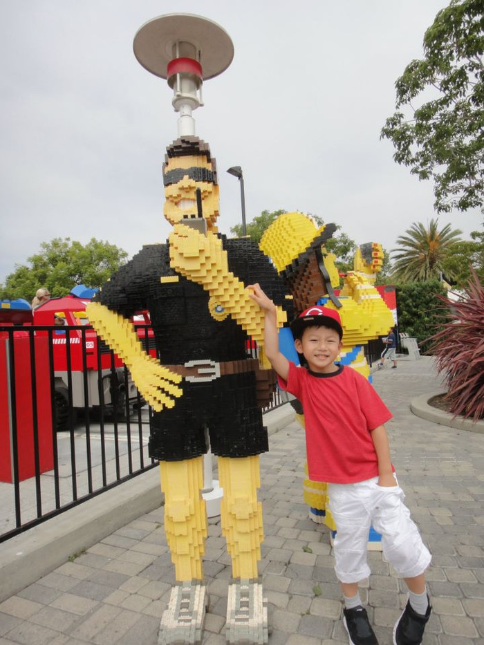 | Cậu bé nhí nhảnh chụp ảnh bên những bức tượng hài hước tại Legoland. |