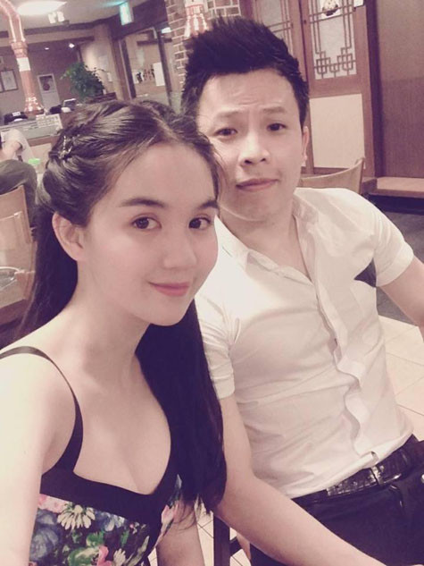 | Ông bầu Khắc Tiệp nhí nhảnh tạo dáng bên Ngọc Trinh |