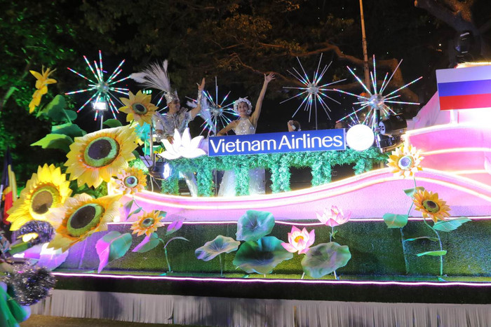 4 xe diễu hành được trang trí đèn hoa rực rỡ theo chủ đề các loài hoa đặc trưng cho 8 quốc gia tham dự DIFF 2019 thắp sáng cả không gian “phố đi bộ tối Chủ Nhật” Bạch Đằng.