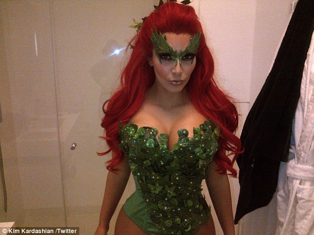 Ngày hôm qua, xuất hiện tại bữa tiệc Halloween tổ chức ở New York, cô Kim "siêu vòng 3" lập tức thu hút sự chú ý với bộ đồ lấy ý tưởng từ lá cây. Tô điểm thêm cho bộ trang phục "vá" lá cây lỗ chỗ này, người đẹp 30 tuổi nhuộm mái tóc đỏ rực vô cùng nổi bật.