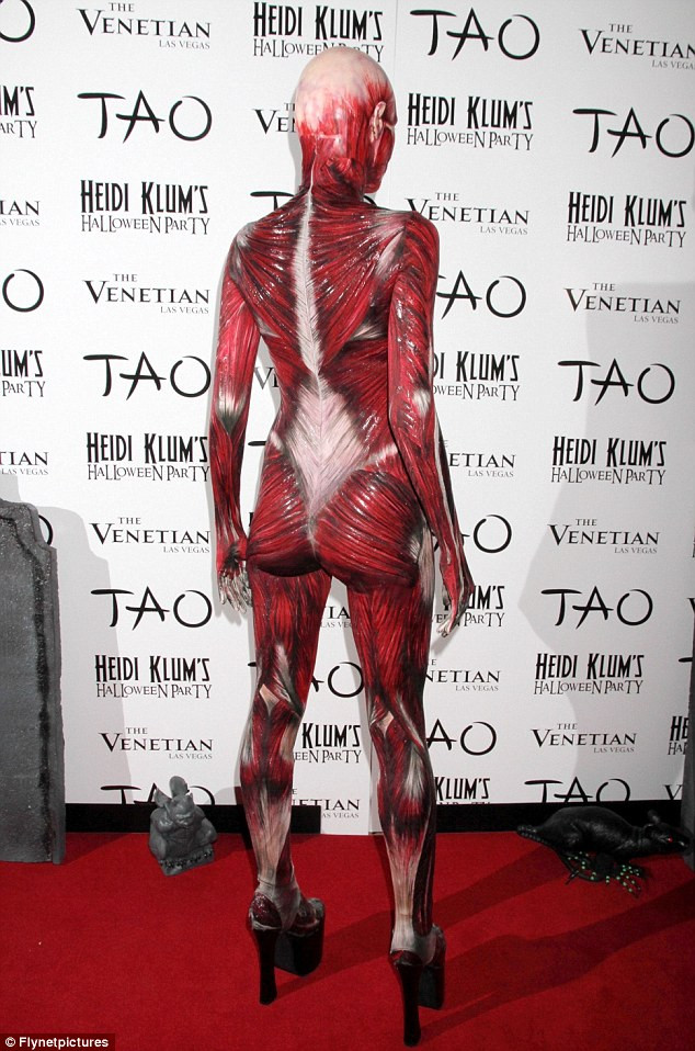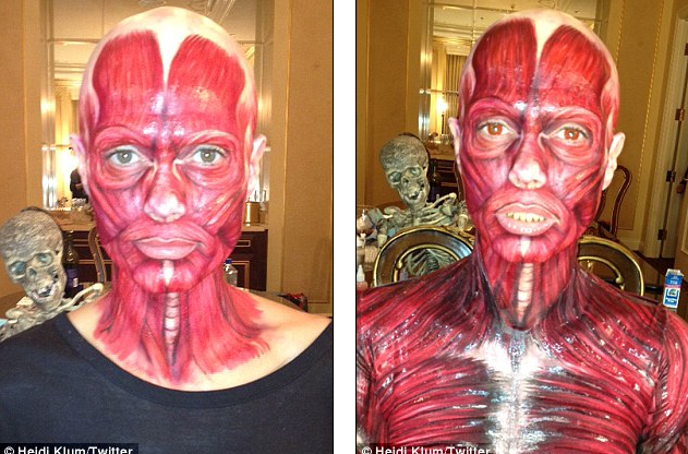 Ngoài Kim Kardashian, một nhân vật khác khiến mọi người phải "sốc toàn tập" trong mùa lễ hội Halloween năm nay là siêu mẫu Heidi Klum. Siêu mẫu 38 tuổi hóa thân thành nhân vật vô cùng kinh dị, đó là một "xác chết" với thân hình đầy... máu, khiến nhiều người phải "nổi da gà".