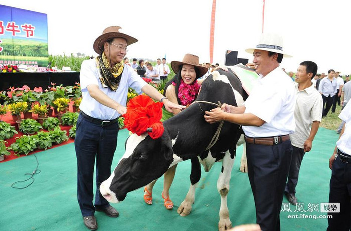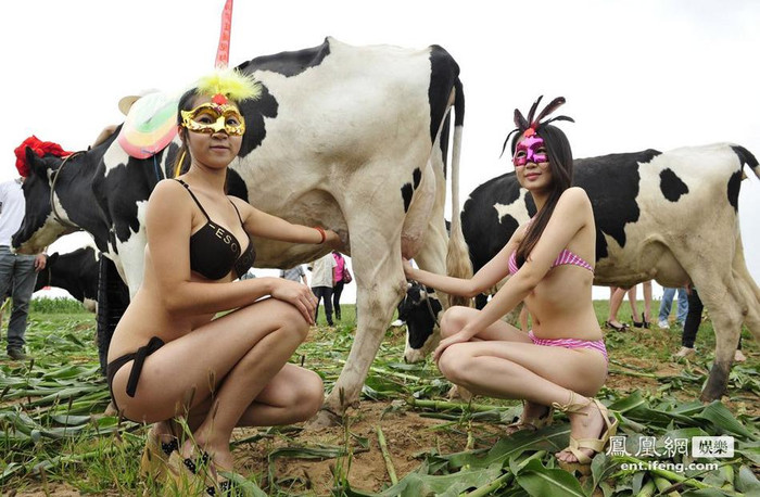 | Vừa là người đại diện, những người mẫu này sẽ "làm hàng" bên cạnh những chú bò sữa bằng cách thò tay vào bầu sữa bò. |