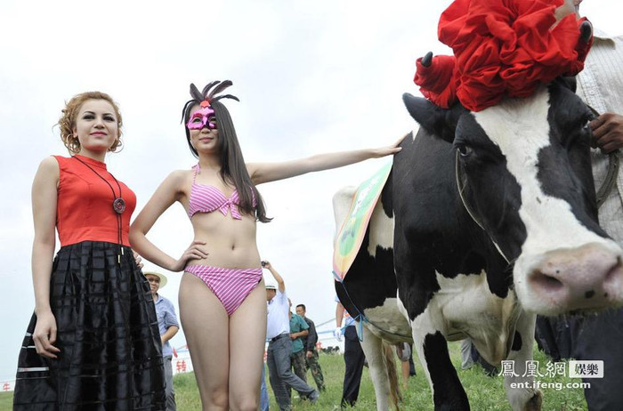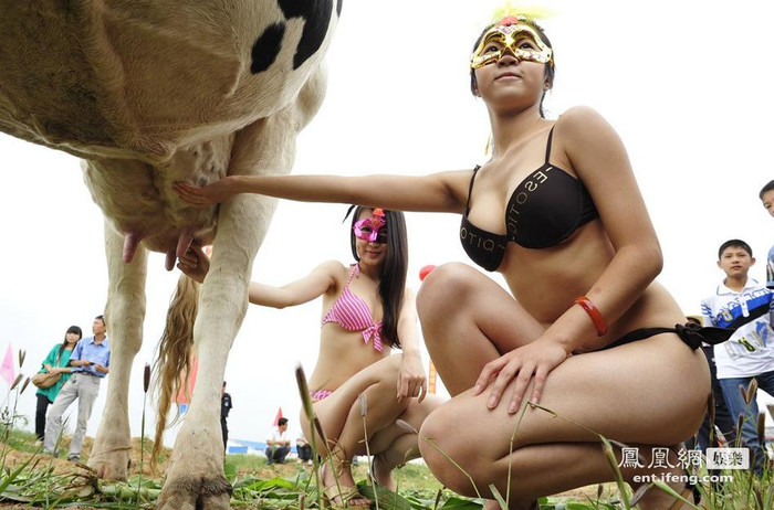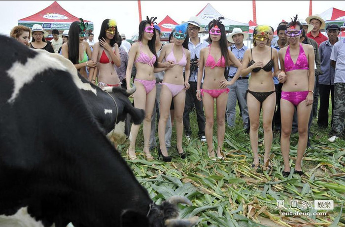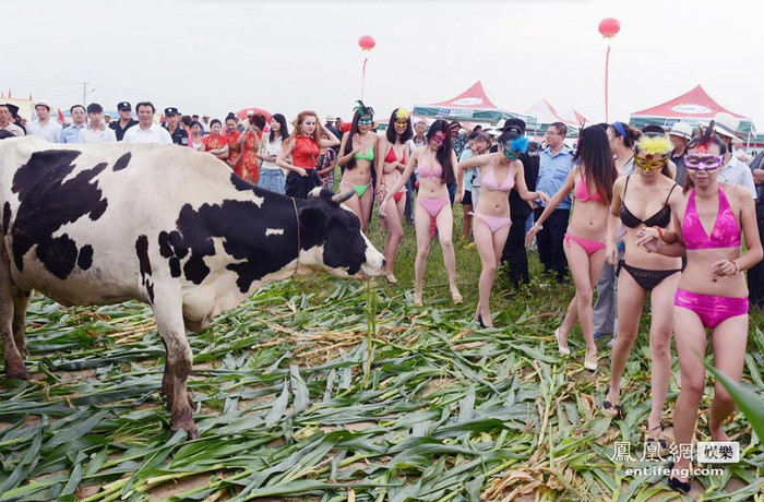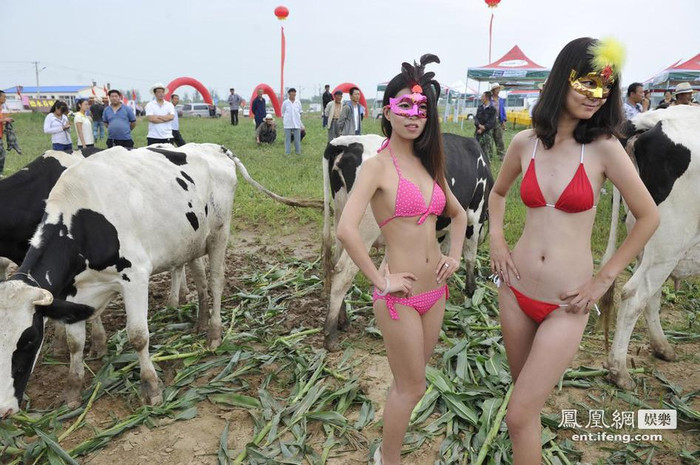 | Các người mẫu trong trang phục bikini nóng bỏng bên cạnh những chú bò sữa tại huyện Sơn Âm, thành phố Sóc Châu, tỉnh Sơn Tây. |