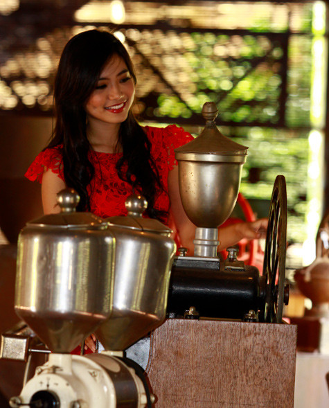 | Giữa những hiện vật độc đáo về cà phê của nhiều châu lục, Ngân tươi cười sảng khoái. |