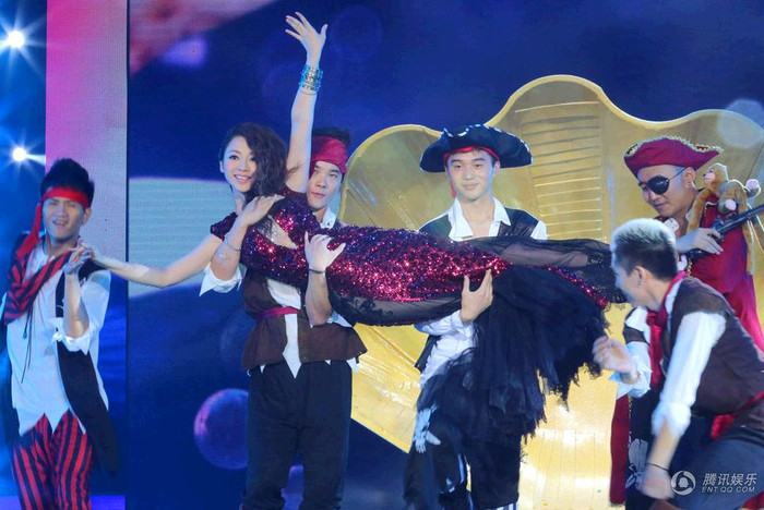 | Trang phục tiếp theo của Liễu Nham giống như một cô mèo đen bên cạnh các nam vũ công với trang phục có tông màu tương tự như nữ ca sĩ. |