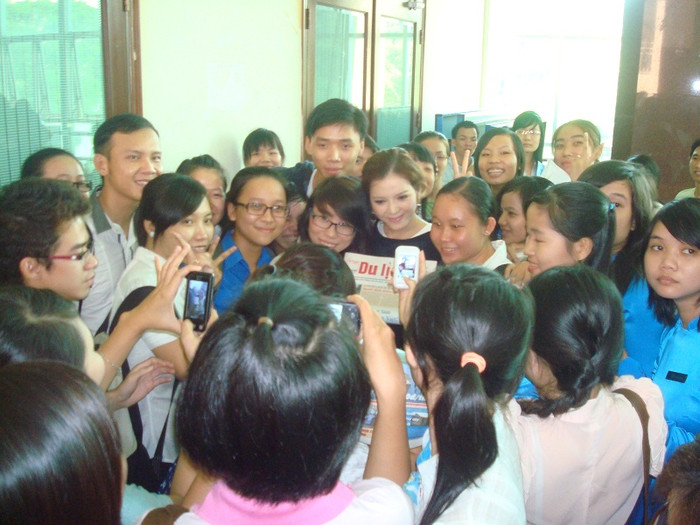 | Sinh viên Đại học KHXV&NV TP.HCM vây quanh Lý Nhã Kỳ và rất hào hứng để bình chọn |