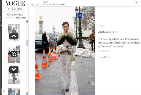 Trên tạp chí thời trang danh tiếng thế giới Vogue được ấn hành tại Nhật Bản số tháng 4/2014 đã bất ngờ xuất hiện hình ảnh của “kiều nữ” Lý Nhã Kỳ trong phần nói về thời trang cao cấp haute couture cùng với các icon thời trang, các ngôi sao trên toàn thế giới.