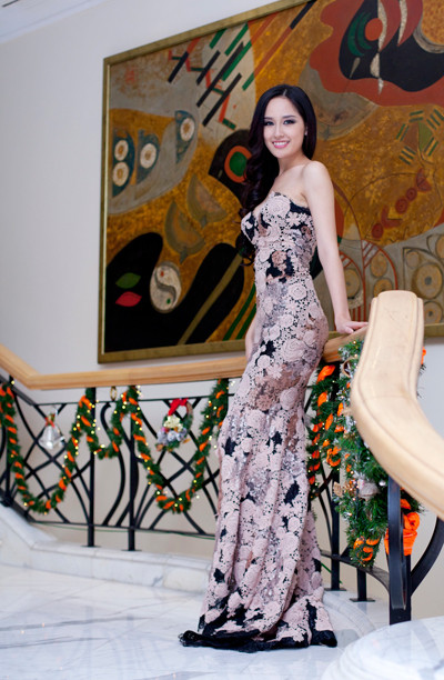 | Không chọn những bộ đầm hàng hiệu đắt tiền, tối 7/12, khi tham dự một buổi tiệc tại thủ đô, Mai Phương Thúy diện bộ cánh ren với những họa tiết hoa hồng của nhà thiết kế Hoàng Hải. Trang phục giúp Hoa hậu khoe được đôi chân dài nuột nà và bờ vai mảnh mai. |
