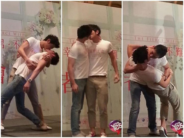 Không những chỉ thực hiện màn khóa môi với đồng nghiệp, 2 anh chàng còn phấn khích đến mức hôn với 3 tư thế khác nhau ngay trên sân khấu. Khi được các phóng viên hỏi về cảm giác lần đầu hôn bạn đồng giới, nam diễn viên Ôn Thăng Hào cho biết anh có cảm giác không giống như từng tưởng tượng rằng nó sẽ khủng khiếp lắm, nam diễn viên này còn lấy ví dụ khi hôn bạn diễn Hựu Thắng giống như cảm giác ăn một con cá sống vậy “mềm mềm và rất dễ chịu”.