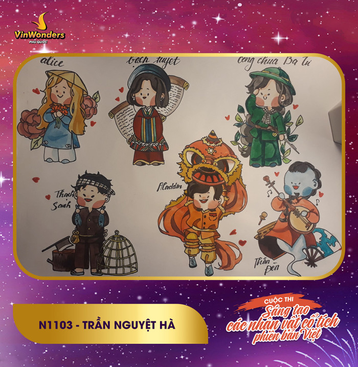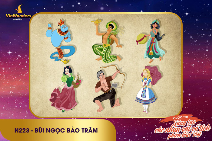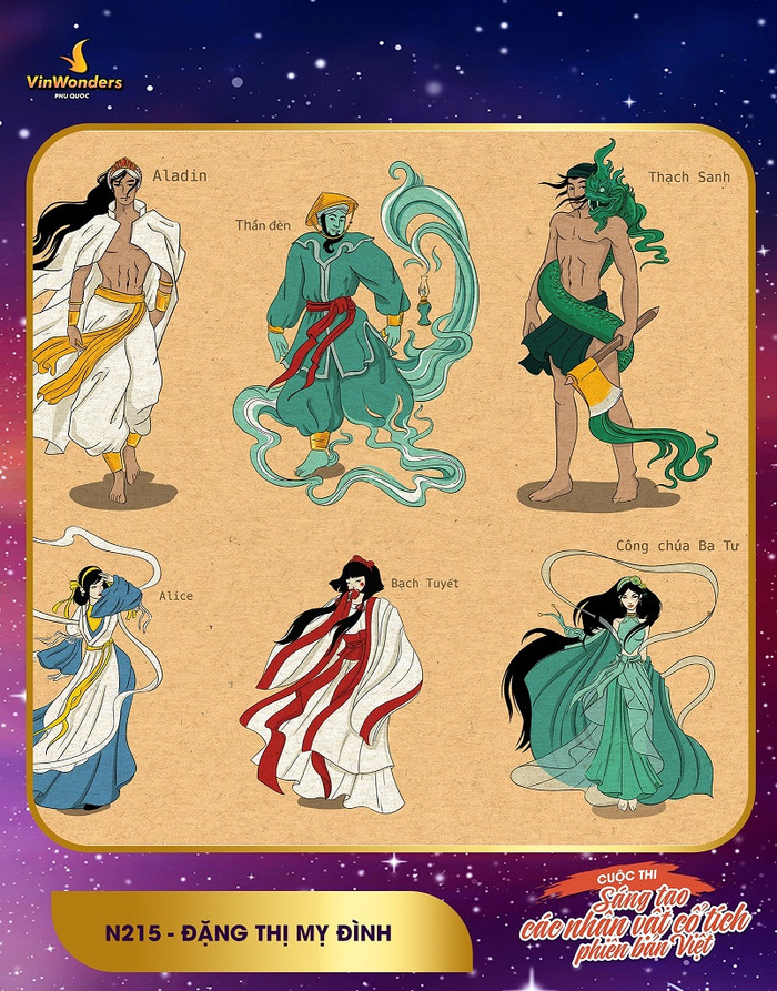 6 nhân vật cổ tích huyền thoại được VinWonders chọn để các thí sinh “Sáng tạo các nhân vật cổ tích phiên bản Việt” là chàng Aladdin dũng cảm, Thần đèn thông minh và hài hước, công chúa Ba Tư nhân ái, nàng Bạch Tuyết chăm chỉ, cô bé Alice đam mê khám phá và chàng Thạch Sanh ngay thẳng và mạnh mẽ.