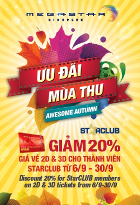 Theo đó, từ ngày 6/9 – 30/9, thành viên sử dụng thẻ StarClub sẽ được giảm ngay 20% giá vé xem phim 2D và 3D trên toàn hệ thống cụm rạp MegaStar Cineplex . Khuyến mãi này được áp dụng cho cả mua vé tại quầy và mua vé online.