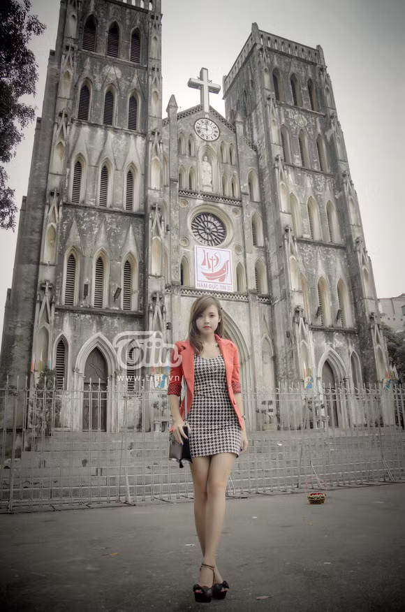 | Với dáng vẻ cổ kính cùng nét kiến trúc đặc sắc, cộng thêm vào đó là khung cảnh cuối thu yên bình và đầy lãng mạn, Nhà thờ lớn Hà Nội trở thành địa điểm yêu thích được nhiều bạn trẻ chọn làm nơi chụp hình. Midu cũng vậy, cô diễn viên với vẻ đẹp trong sáng này dường như rất hợp với khung cảnh nơi đây. |