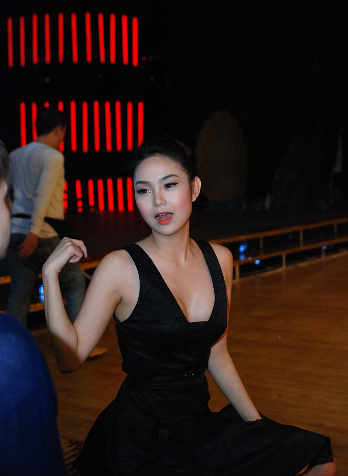 | Minh Hằng vui vẻ trò chuyện với vũ công nước ngoài. |