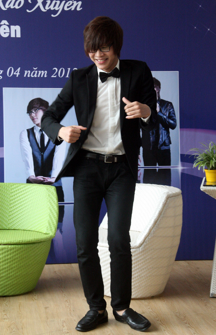 | Trước lời gợi ý của một số phóng viên rằng, Minh Kiên có thể trình diễn lại các động tác trong MV "Xao xuyến" mới ra mắt, chàng trai đã rất hào hứng thực hiện lại các động tác vũ đạo đẹp mắt. |