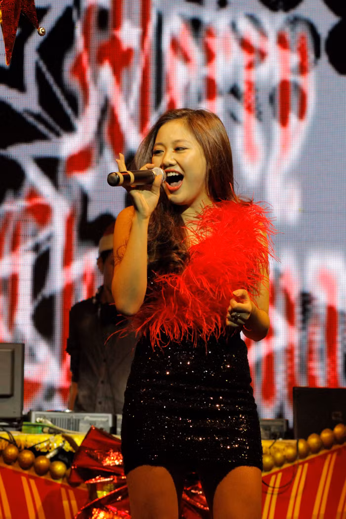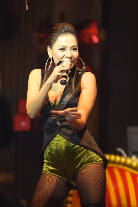 | Tâm điểm của Dạ tiệc đỏ đêm 24 là Thu Minh. Giọng ca "Đường cong" cuốn hút khán bằng những giai điệu sôi động của "Taxi", "Chuông gió"...cùng phong cách gợi cảm thường thấy. |