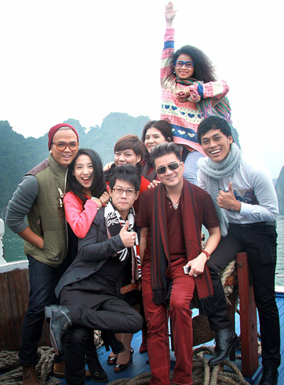 | Chuyến thăm quan vịnh Hạ Long còn có một số thí sinh trong đội "The Voice" của Đàm Vĩnh Hưng. Dù run rẩy vì lạnh nhưng các ca sĩ trẻ vẫn hăng hái pose hình kỷ niệm. |