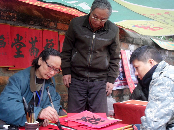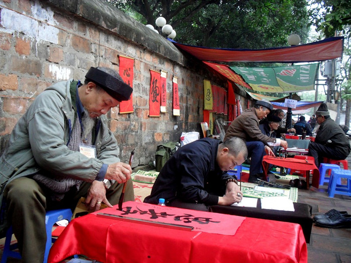 | Theo thông lệ, dịp áp Tết hàng năm, các "ông đồ" lại tập trung về Văn Miếu để viết thư pháp |
