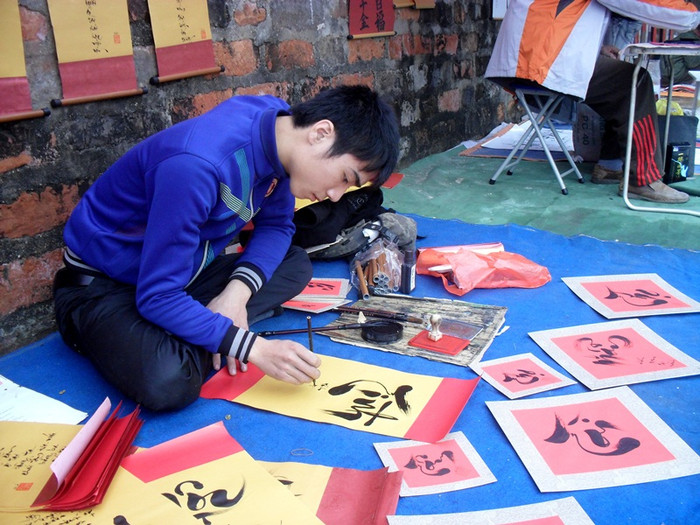 | "Ông đồ" trẻ này đang viết một vế câu đối đỏ, nhiều bạn trẻ khác đứng xem. |