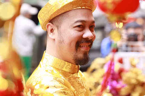 | Diện trang phục áo dài đỏ -vàng lộng lẫy của NTK Đức Hùng, bộ 3 trở thành tâm điểm chú ý nơi xuất hiện. |