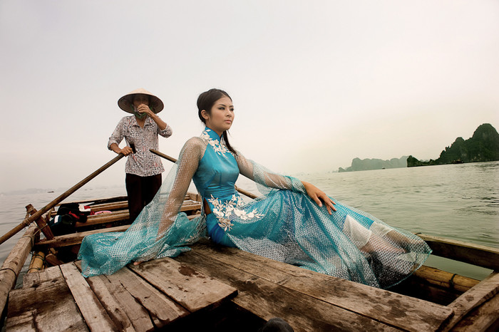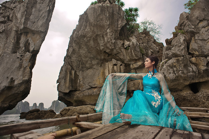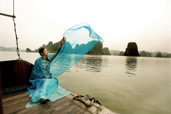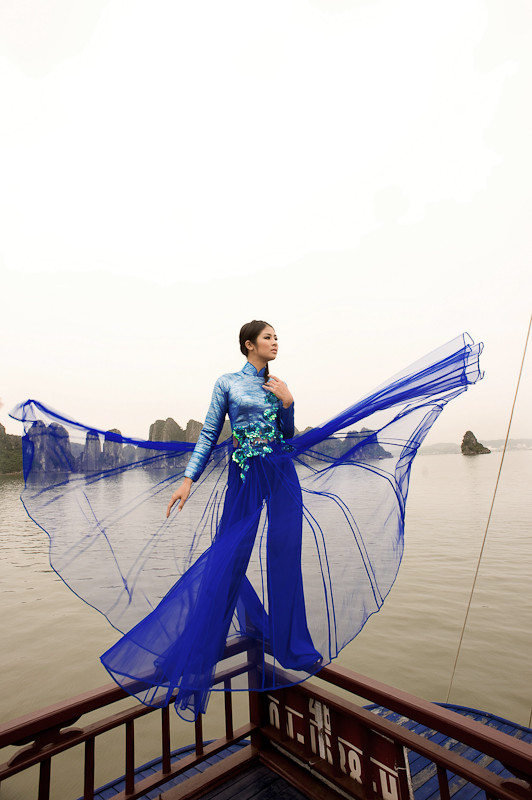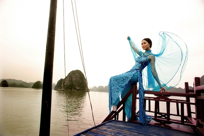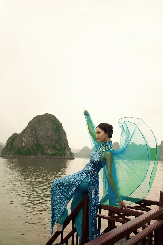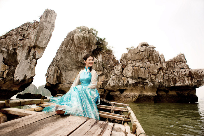 | Bộ ảnh áo dài được thực hiện tại vịnh Hạ Long vào những ngày cuối thu. Hoa hậu Việt Nam 2010 Ngọc Hân không ngại "leo" thang dây... |