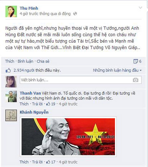 "Người đã yên nghỉ nhưng huyền thoại về một vị tướng, người anh hùng đất nước sẽ mãi mãi luôn sống cùng thế hệ con cháu như một sự tự hào, một biểu tượng của tài trí, sắc bén và mạnh mẽ của Việt Nam với thế giới...Vĩnh biệt Đại tướng Võ Nguyên Giáp..", ca sĩ Thu Minh chia sẻ.