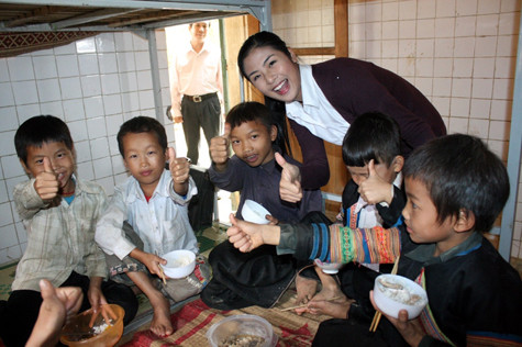 | Hình ảnh Ngọc Hân chơi đùa và cõng học sinh miền núi qua quãng đường trơn trượt. |