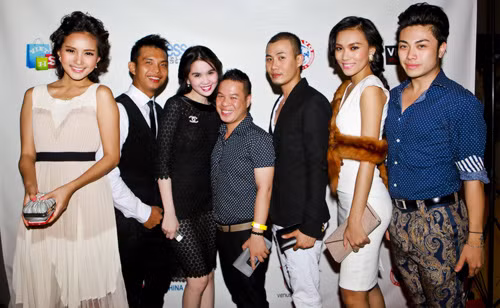 | Cô tạo dáng chụp ảnh cùng "ông trùm" chân dài Vũ Khắc Tiệp và doanh nhân Huy Cận. |