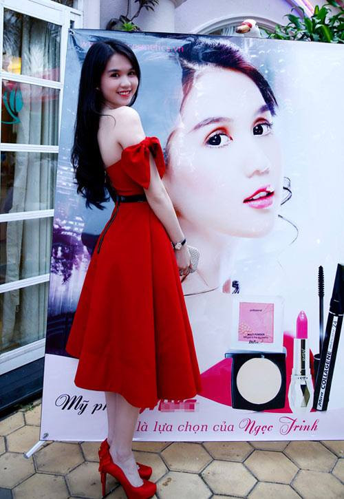 Ngày 17/7, Ngọc Trinh bất ngờ xuất hiện tại Cần Thơ khi cô tham gia một buổi khai trương thương hiệu mỹ phẩm mới. Đây là một thương hiệu mà cô nhận làm gương mặt đại diện. "Nữ hoàng nội y" ghi điểm với bộ váy đỏ trễ vai để lộ vai trần gợi cảm. Cô thu hút mọi ánh mỗi nhìn lần xuất hiện.