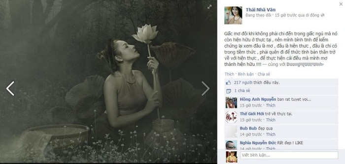 Trước đó một vài giờ, Thái Nhã Vân đã có một tấm hình chụp bên hoa sen với lời chia sẻ “Giấc mơ đôi khi không phải chỉ đến trong giấc ngủ mà nó còn hiện hữu ở thực tại, nên mình bình tĩnh để kiểm chứng lại xem đâu là mơ, đâu là hiện thực, đâu là chỉ có trong tiềm thức, phải quên đi để thức tỉnh bản thân trở về với hiện thực, để thực hiện cái điều mà mình mơ thành hiện hữu”.