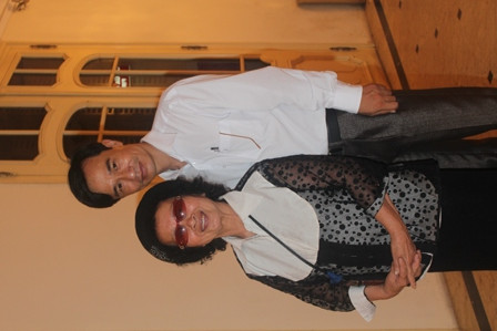 | Bà ngoại Tùng Dương (bên phải) chụp ảnh với vợ nhạc sĩ Doãn Nho. Ảnh: Lê Phương |