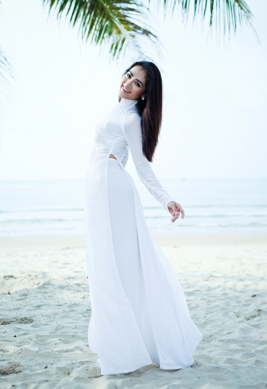 | Khung cảnh trời mây quang đãng, biển mênh mông nước, gió vi vu, xào xạc những tán dừa...Thúy Nga mặc áo dài trắng tinh khôi, nổi bật trong một buổi sáng yên lành của miền quê vắng vẻ. |