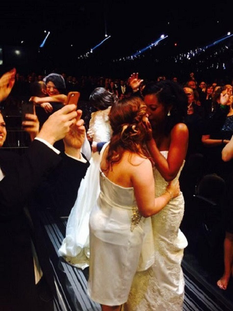 | Trên nền nhạc Same Love của Macklemore & Ryan Lewis, 34 cặp đôi - cả đồng tính lẫn dị tính - đã thực hiện lễ cưới ngay trên sân khấu Grammy. |