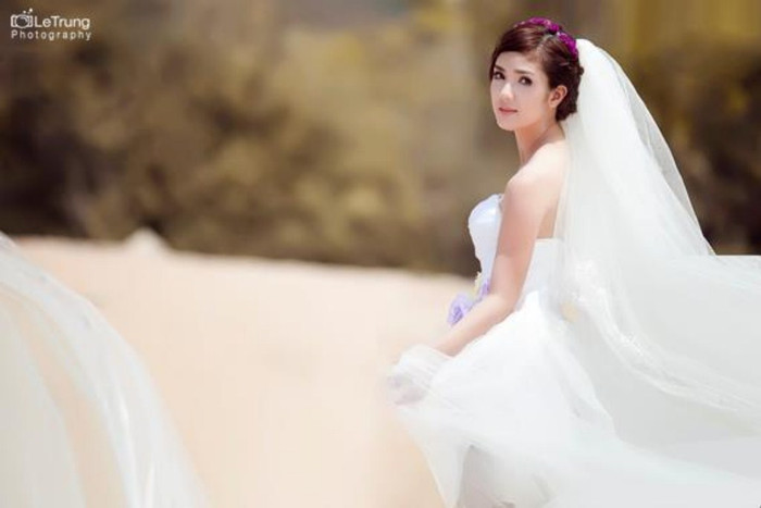 | Lung linh trên bãi cát... chiếc khăn cài đầu tung bay trong gió, Thùy Linh như cô dâu mỏng manh, yếu ớt rất cần che chở |
