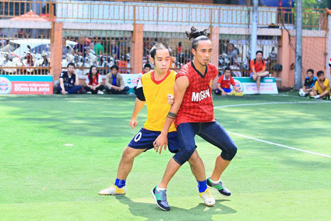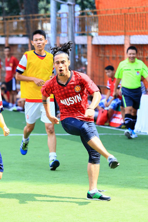 | Với niềm đam mê dành cho trái bóng, Phạm Anh Khoa đã ra sân cùng các cầu thủ để tham gia trận đấu bóng giao hữu và "cháy" hết mình cùng đam mê sân cỏ. |