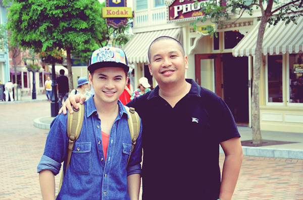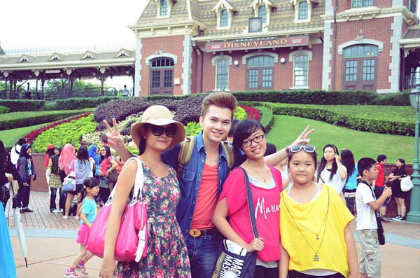 | Quang Huy rất chịu khó làm phó nháy, ghi lại những khoảnh khắc đẹp của bà xã và ca sĩ Nam Cường tại Disney Land. |