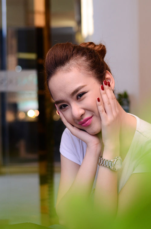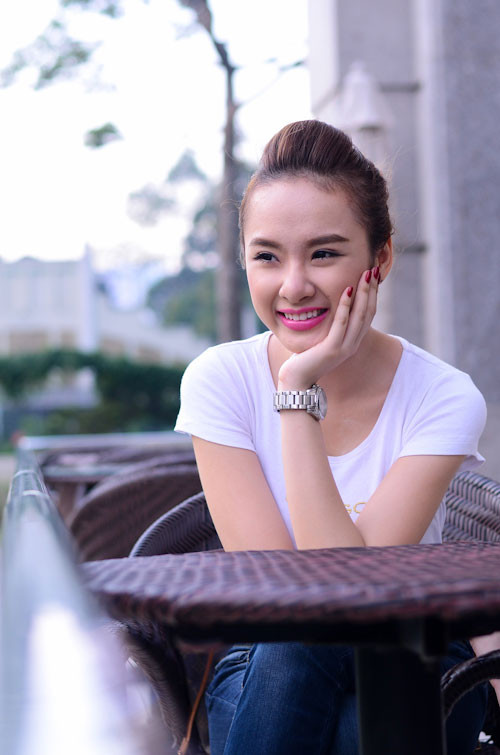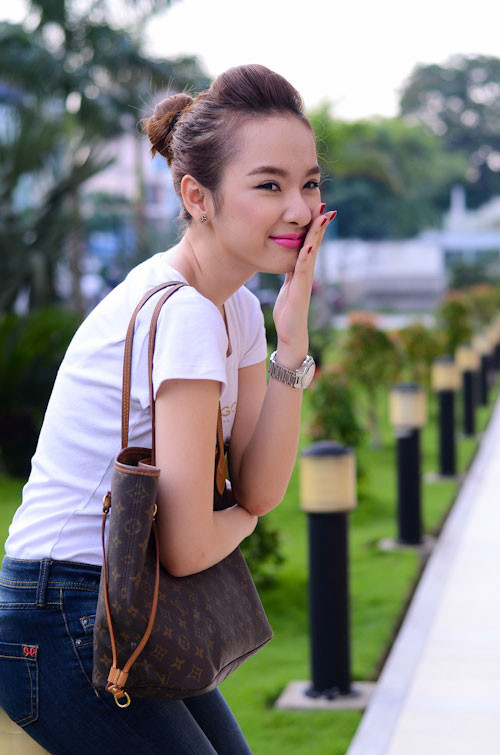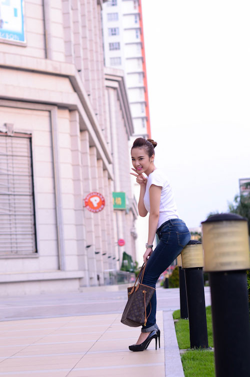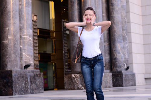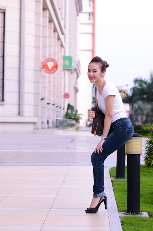 "Bà mẹ nhí” xuống phố với phong cách thời trang giản dị với áo thun, quần jeans năng động nhưng vẫn không kém phần xinh tươi.