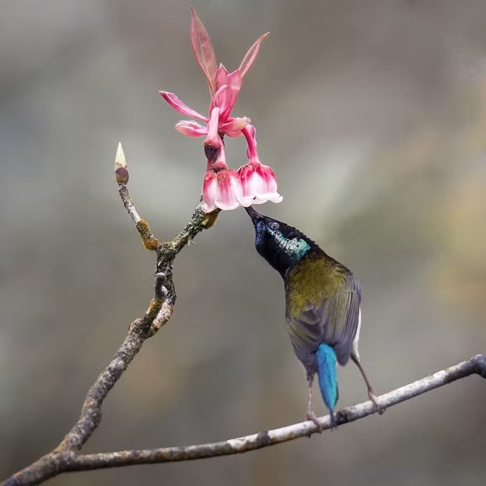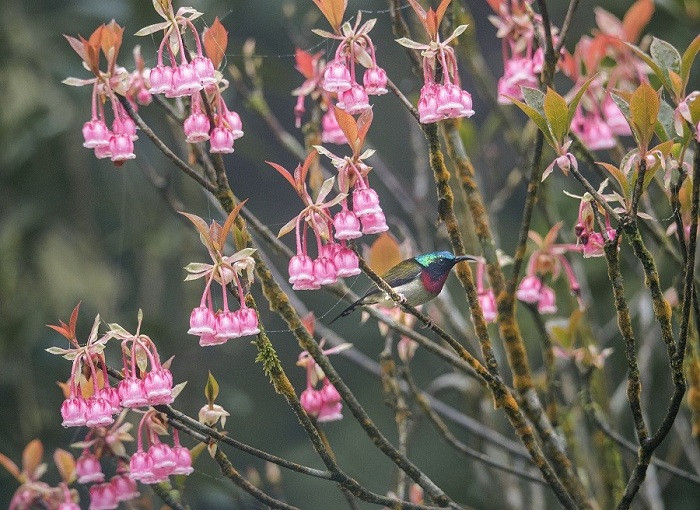 Những chú chim đuôi nhọn háo hức vờn vít quanh những chiếc chuông nhỏ xinh treo lơ lửng trên cành hoa thô mộc mốc thếch màu thời gian, tạo nên khung cảnh sinh động tự nhiên đầy lôi cuốn trong bức hình của các nhiếp ảnh chuyên nghiệp lẫn nghiệp dư…