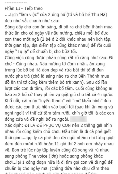 Quay lại guồng quay của The Voice Kids. Do thời gian ở chăm con kéo dài quá lâu, nhiều gia đình có điều kiện đã tự bỏ tiền mua vé máy bay, bay ra bay vào để đổi lịch chăm con nhưng cũng có nhiều gia đình từ đầu đến cuối cũng chỉ có một bố hoặc một mẹ. Thời gian kéo dài, tiền nong cũng cạn kiệt cùng với việc một số bé cũng đang tuổi dậy thì nên tâm sinh lý cũng bất thường. Thế là mẹ - con, bố - con, anh – em đôi khi cũng xảy ra va chạm. Chẳng thế mà có bữa đang ăn thì nghe ầm ĩ ở phòng trên, tôi bỏ bát cơm chạy lên xem thì thấy mẹ khóc con khóc. Hỏi con thì con không trả lời, hỏi mẹ thì: “Nó được lên tivi nên giờ nó to hơn em rồi anh, nó tưởng nó nổi tiếng rồi nên không cần mẹ anh ạ. Chắc mai mốt nó về nó thành siêu sao kiếm tiền nuôi em quá. Em sắp xếp quần áo về quê để nó tự ở lại xem nó nổi tiếng ra sao?”. Ôi trời ơi!
