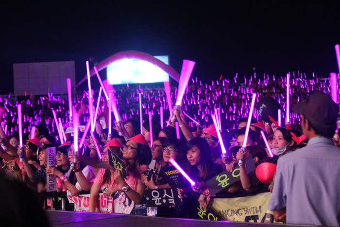 | Hàng ngàn fan Việt khiến cả sân vận động Quân khu 7 rực sáng bởi những chiếc đèn led được trang bị từ trước đó. Dường như lúc này phe áo hồng (fan SNSD) đang giữ vị trí áp đảo với hơn phân nửa khán giả tại đây. |