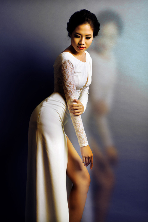 | Cô tự tin khoe dáng trong bộ váy xẻ của nhà thiết kế Lê Thanh Hòa. Bộ ảnh thực hiện với sự hỗ trợ trang điểm của chuyên gia make-up Đăng Minh. Stylist: TrungBC. |