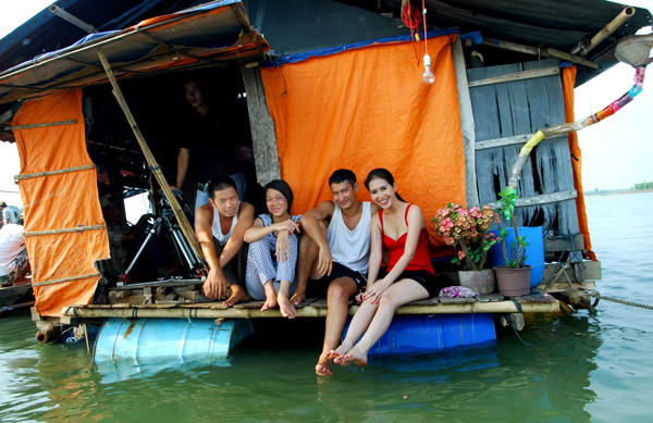 | Các diễn viên chính chụp ảnh kỷ niệm sau những cảnh quay lênh đênh trong căn nhà nổi trên sông. |