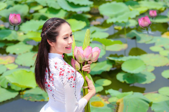 | Mới đây, khi ra Hà Nội quay quảng cáo, Thanh Thúy đã thực hiện bộ ảnh kỷ niệm với hoa sen vào lúc 12h trưa. |