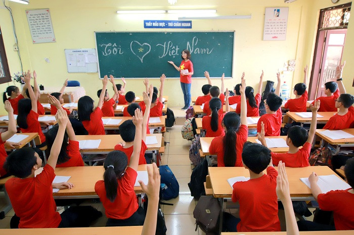 | Trong lớp học, dòng chữ "Tôi yêu Việt Nam" được viết ngay trên bảng lớn như một lần nữa thể hiện tình yêu với Tổ quốc, với đất nước của cô và trò Trường trung học cơ sở Thành Công. |