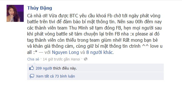 | Nhằm bảo đảm tính bí mật cho The Voice Việt, BTC đã yêu cầu 56 thí sinh của 4 team Hồ Ngọc Hà, Thu Minh, Đàm Vĩnh Hưng, Trần Lập khóa Facebook (khóa Wall, Comment) từ 0h ngày 6/8 cho đến ngày 19/8 - ngày phát sóng tập 1 của Vòng Đối Đầu. |