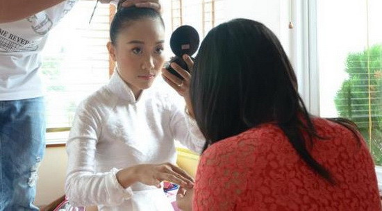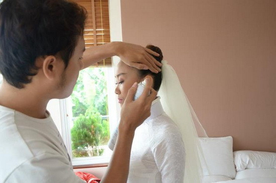 | Nữ ca sĩ trang điểm trước khi chú rể đến. |